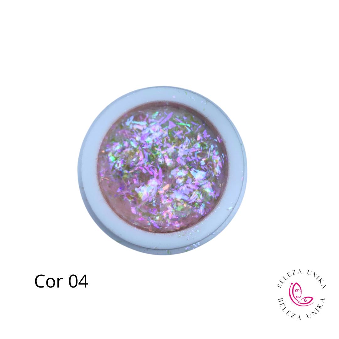 Flocos com efeito holográfico que refletem múltiplas cores conforme a luz. Ideal para acabamento sofisticado em nail art, proporcionando brilho intenso e visual diferenciado.