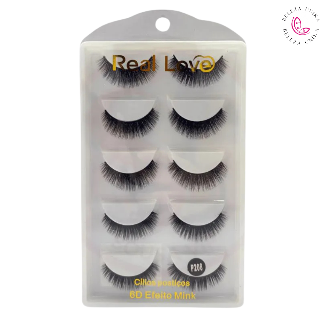 Cílios Postiços 6D Efeito Mink P208 da Real Love! Com design moderno e fios super macios, eles proporcionam volume intenso e alongamento elegante, sem perder a leveza e o conforto.
