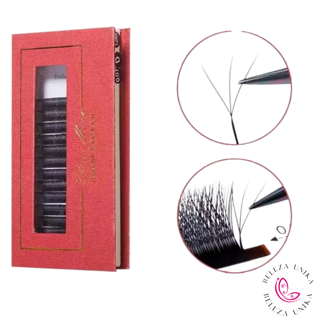 Com espessura 0.07 e curvatura D, oferecem um efeito marcante, com excelente abertura do olhar e conforto durante o uso. O mix de comprimentos 8 a 14 mm permite versatilidade nos mapeamentos e personalização dos alongamentos.