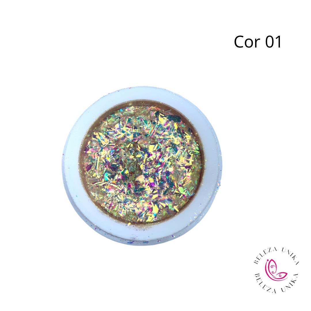 Flocos com efeito holográfico que refletem múltiplas cores conforme a luz. Ideal para acabamento sofisticado em nail art, proporcionando brilho intenso e visual diferenciado.