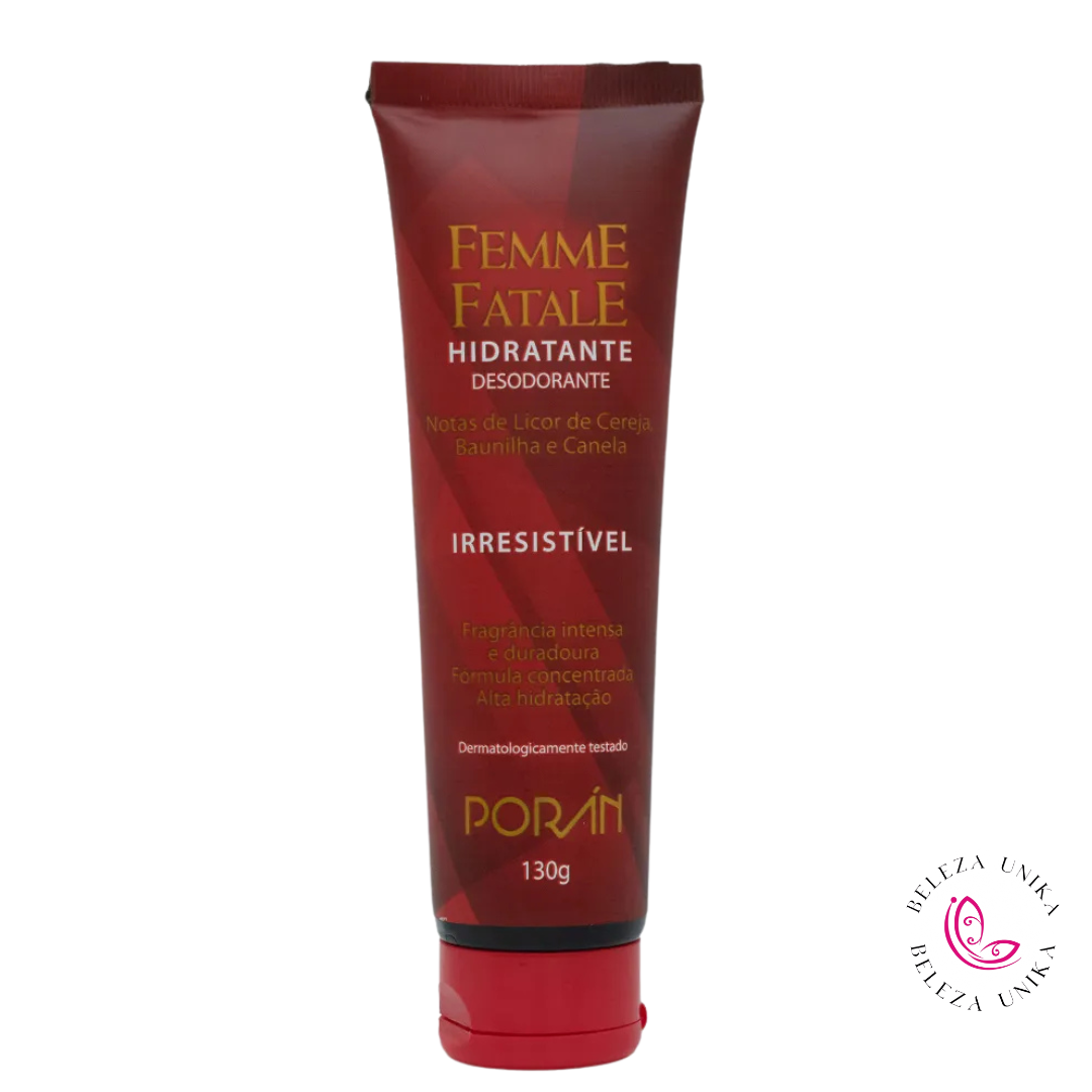 Hidratante Desodorante Femme Fatale Irresistível Porán 130g é a escolha ideal para quem deseja unir cuidados com a pele e uma fragrância marcante. Com uma fórmula concentrada e de alta performance, oferece hidratação intensa e prolongada, enquanto envolve o corpo com notas sofisticadas de licor de cereja, baunilha e canela - uma combinação sedutora e inesquecível.