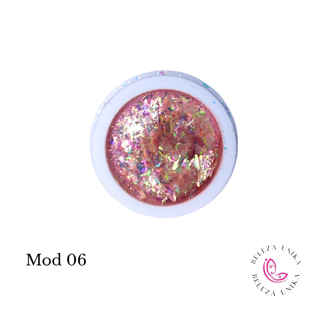 Flocos com efeito holográfico que refletem múltiplas cores conforme a luz. Ideal para acabamento sofisticado em nail art, proporcionando brilho intenso e visual diferenciado.