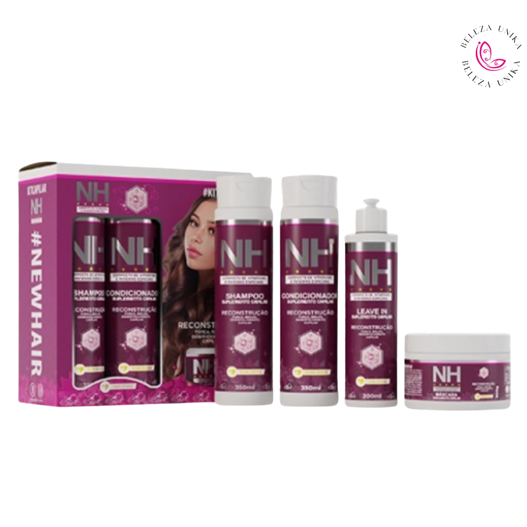 NH New Hair Kit Capilar possui funções múltiplas que aceleram o desenvolvimento dos seus fios. Contém shampoo, condicionador, leave-in e máscara com um complexo de aminoácidos que nutre a fibra capilar com vitaminas.