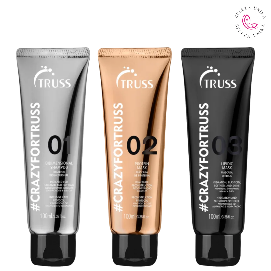 Kit TRUSS CRAZY FOR TRUSS é ideal para cabelos danificados e frágeis que sofreram com a química. De forma simples e prática, você devolve a vitalidade dos fios em apenas 7 minutos. Recomendado para ser usado durante o banho, é a solução para alcançar cabelos saudáveis e hidratados.