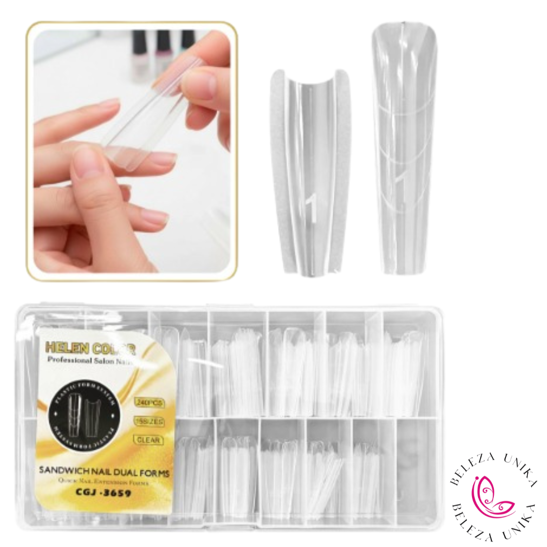 O Molde Sanduíche Dual Forms Helen Color é ideal para a construção de unhas em gel, acrílico ou polygel, proporcionando praticidade, agilidade e acabamento uniforme. O kit conta com 240 unidades em diversos tamanhos, permitindo melhor adaptação a diferentes formatos de unhas.