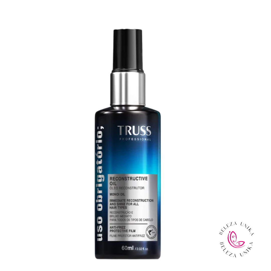 Óleo Reconstrutor Uso Obrigatório; TRUSS conta com fragrância que mantém o DNA da linha Uso Obrigatório;com notas frutais, e incorpora tecnologia que libera perfume através do contato com o oxigênio, prolongando a sensação de cabelos perfumados.