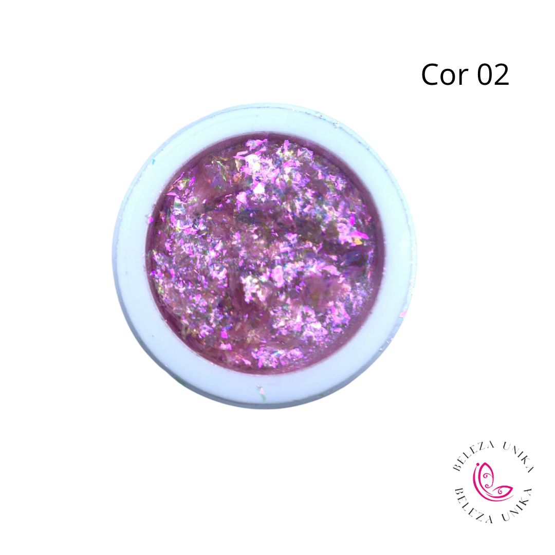 Flocos com efeito holográfico que refletem múltiplas cores conforme a luz. Ideal para acabamento sofisticado em nail art, proporcionando brilho intenso e visual diferenciado.