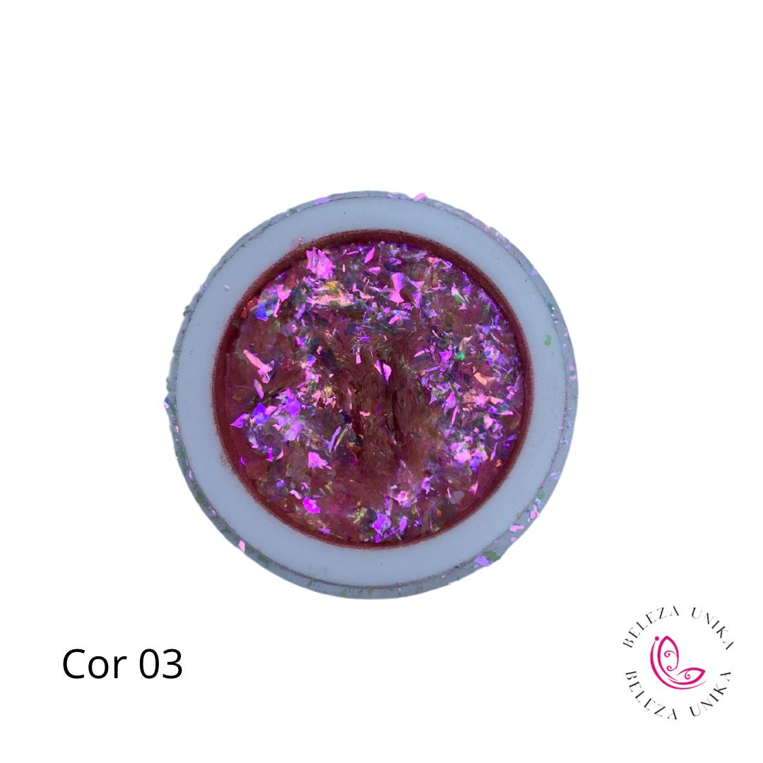 Flocos com efeito holográfico que refletem múltiplas cores conforme a luz. Ideal para acabamento sofisticado em nail art, proporcionando brilho intenso e visual diferenciado.