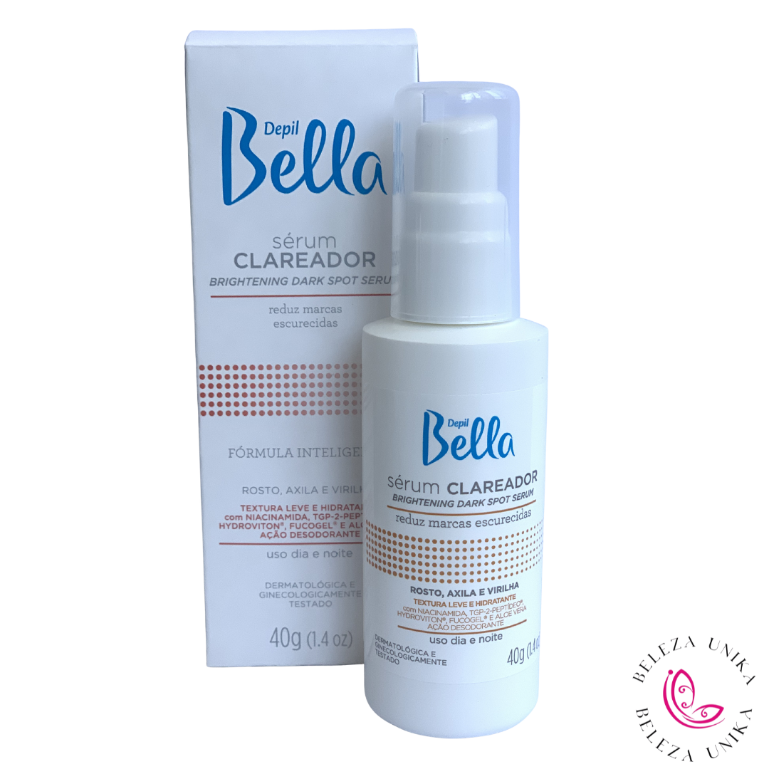 O Sérum Clareador Rosto, Axila e Virilha Depil Bella – 40 g é um cosmético desenvolvido para ajudar a uniformizar a tonalidade da pele em áreas escuras, como rosto, axilas e virilha.