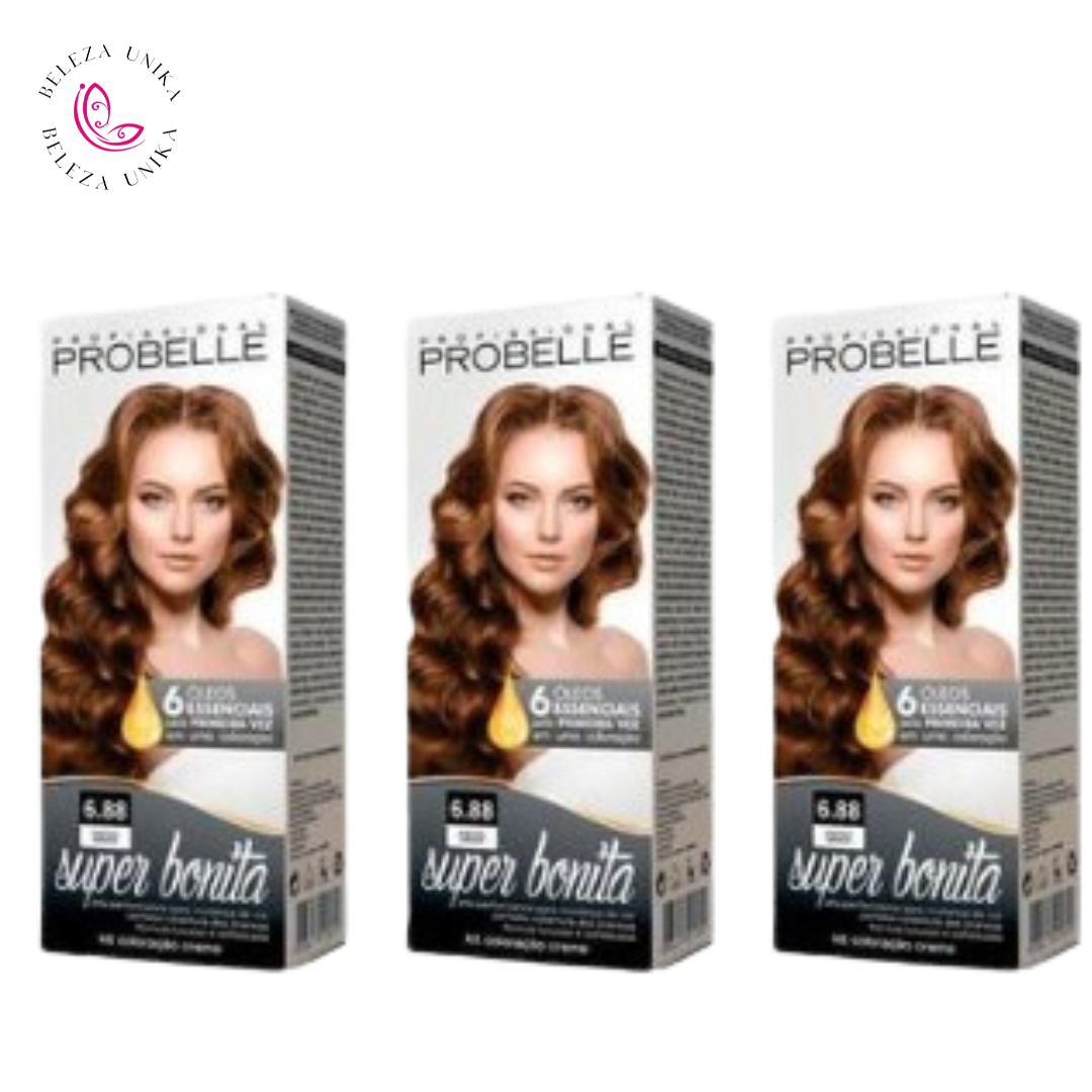 Kit de Tinta Probelle Super Bonita, desenvolvido com tecnologia avançada para proporcionar cor intensa, brilho duradouro e cobertura perfeita dos fios brancos. Sua fórmula enriquecida com óleo de argan, queratina e colágeno nutre profundamente os cabelos, garantindo maciez, força e aparência saudável.